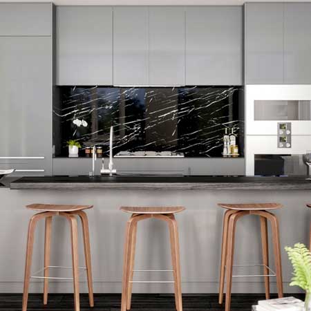 The kitchens at Belpark are subtly sophisticated, designed around a generous central island with ample space for preparing multi-course meals or midnight snacks. Imported Italian cabinets, sleek quartz countertops and a marble slab backsplash complement the stylish and efficient Gaggenau appliances, including a gas range and full-height wine fridge.