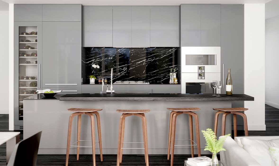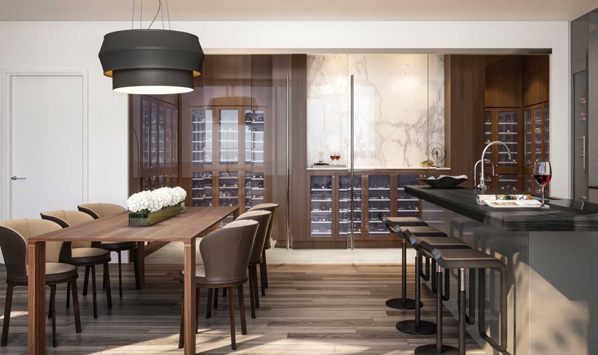 The kitchens at Belpark are subtly sophisticated, designed around a generous central island with ample space for preparing multi-course meals or midnight snacks. Imported Italian cabinets, sleek quartz countertops and a marble slab backsplash complement the stylish and efficient Gaggenau appliances, including a gas range and full-height wine fridge.