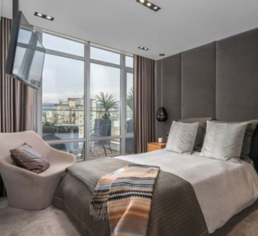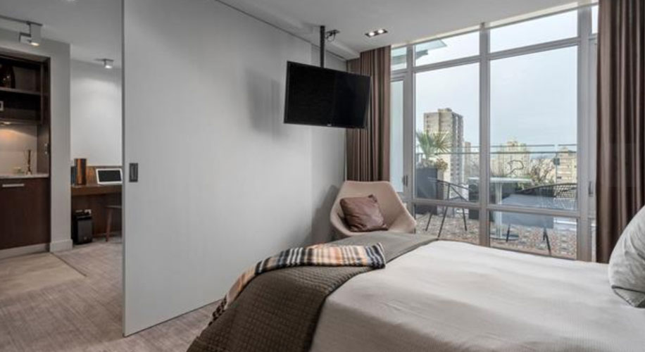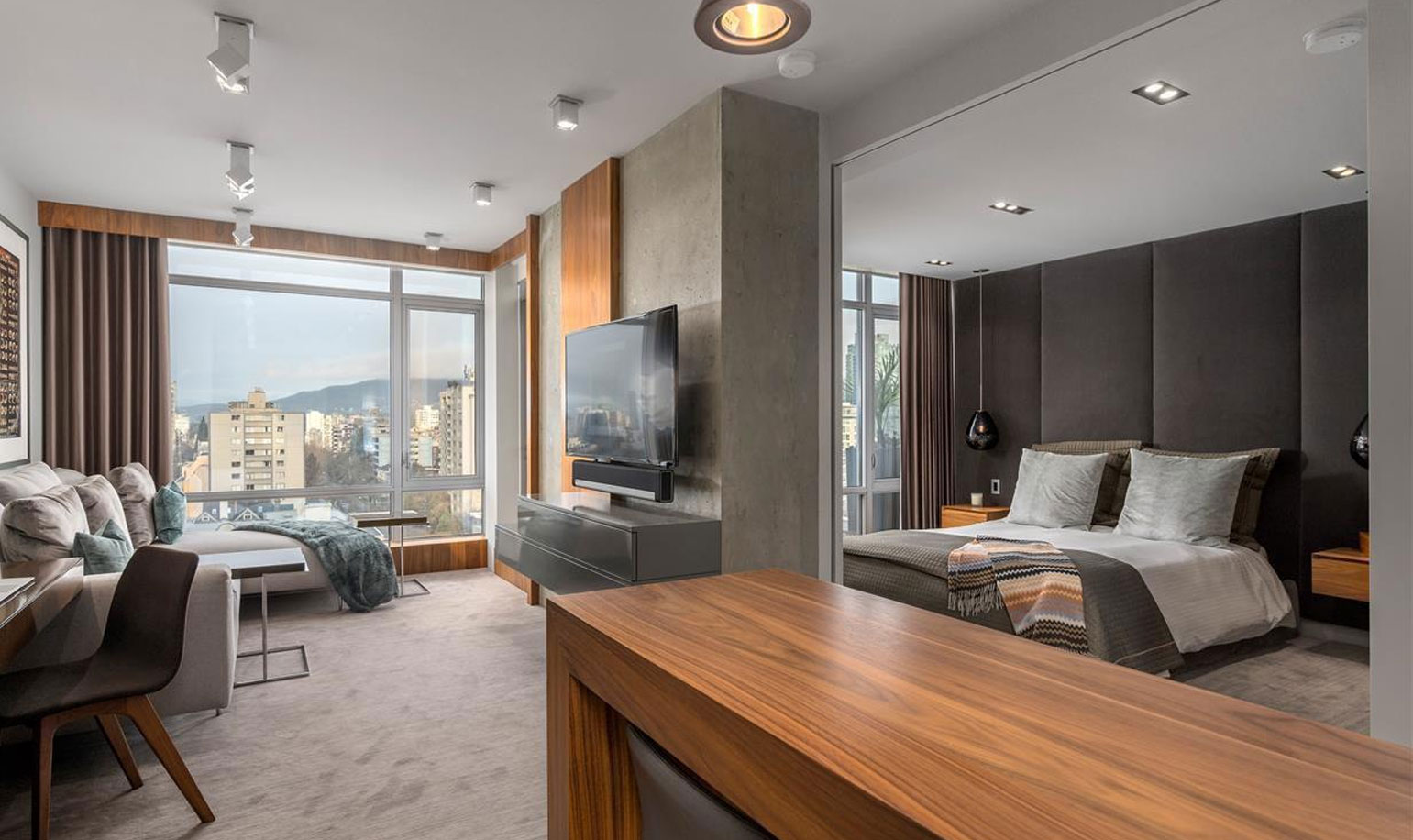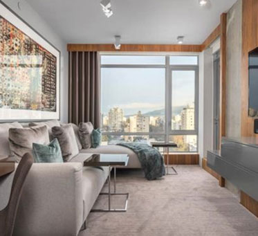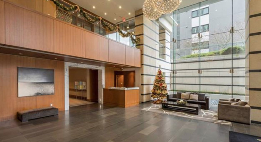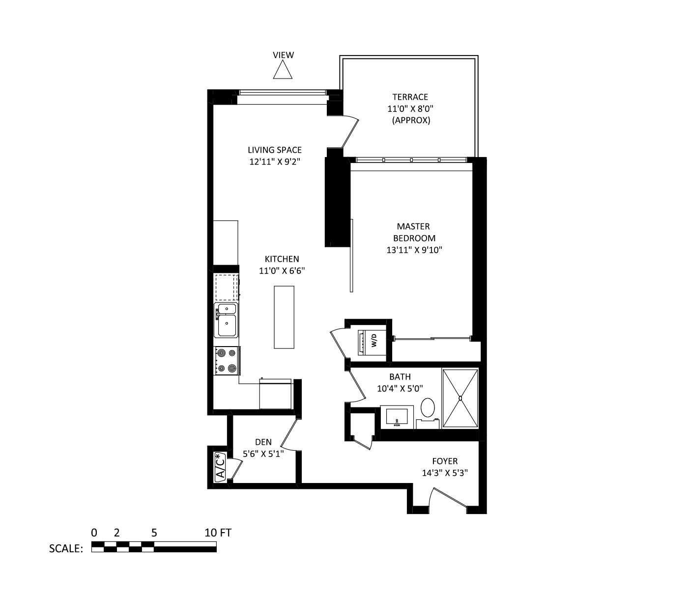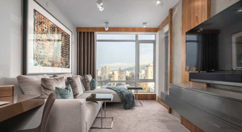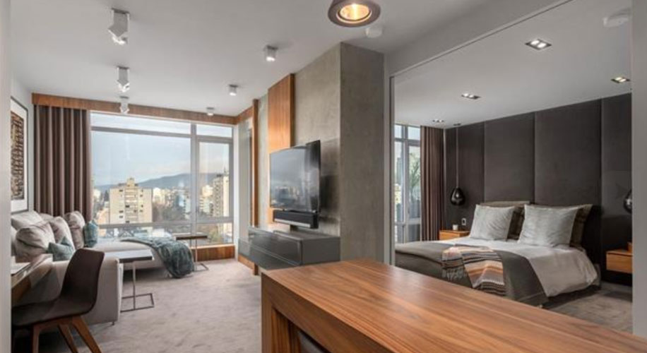 World Class Residence in the prestigious PATINA - Concert Properties' Flagship development. This extensively renovated and beautifully designed 1 bedroom + den feels like a 5 star luxury hotel suite. Enjoy floor to ceiling windows with luxurious drapery, exposed concrete, beautiful lighting design all within an open plan suite with movable wall for bedroom privacy. Appreciate Air-Conditioning, Mohair feature bedroom wall, built in bedside tables, desk, media consoles and customized mill work throughout. Spa like bathroom, rain shower, heated floors and bath towel rack. This home includes a spacious 100 sq ft terrace. Building amenities include concierge services, fitness centre, entertainment and lounge and common roof deck. Showings by Private Appointment