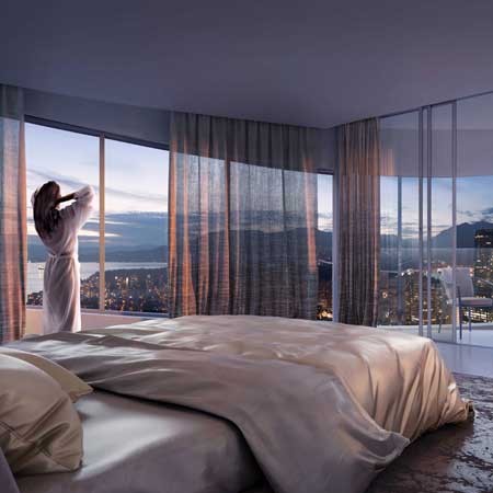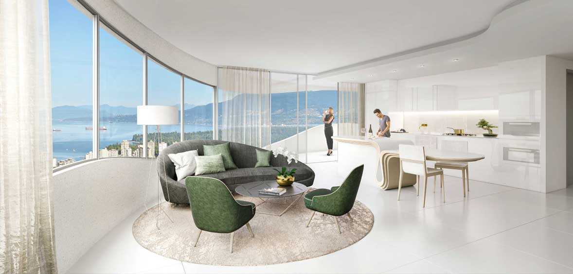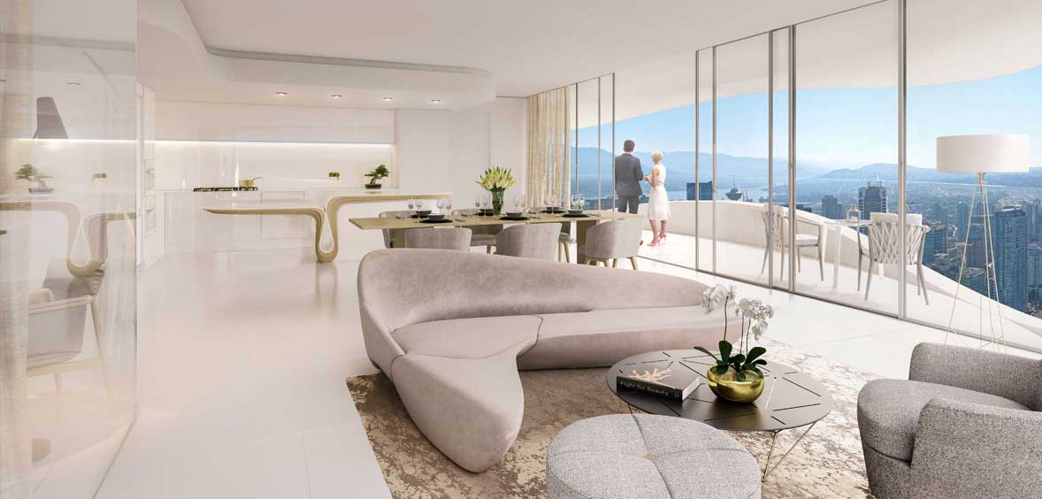 The Butterfly is Westbank's newest work of art coming to downtown Vancouver. This stunning building features Home interiors that are custom designed and curated by Bing Thom Architects. SOme highlights include exterior courtyards on each floor as opposed to a traditional corridor featuring custom tree planters every third floor, large-scale matte white flooring throughout all living areas, exterior walls lined with honed white pre-cast concrete walls with terrazzo finish interior. The custom designed, Italian crafted kitchen includes soft-closing precision cabinet drawers and doors with wood-reveal interiors, a custom designed kitchen island organically shaped with eucalyptus wood base and white matte solid surface countertops. More details will be released soon. Sign up now with the form above for your private preview.
